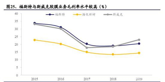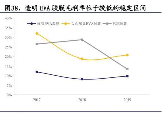 (2)胶膜生产工艺较为成熟,行业竞争已较为充分,生产成本接近 90%来自于原材料 EVA 树脂,龙头企业毛利率维持在 20%左右,其利润主要来自于规模效应构筑的成本优势。
