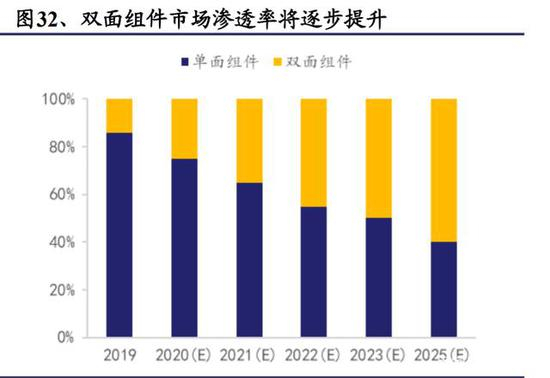 双面组件将成为市场趋势。双面组件将背板替换为光伏玻璃,具有更高发电量、更强稳定性和更长使用寿命的特征,有助于提升组件效率。2019 年,单面组件仍然为市场主流,占比 86%。随着下游应用端对于双面组件发电增益的认可,以及安装方式的逐步优化,双面组件的市场份额将逐步增大。