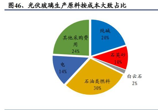 光伏玻璃生产成本相对刚性。在原片玻璃生产环节中,重质纯碱和石英砂是主要的生产原材料。为了保证原片玻璃的高太阳能透过率,玻璃含铁量比普通玻璃低,一般要控制在 0.015%-0.02%左右;因此原片玻璃生产中需使用高透光度低铁含量石英砂,石英砂中二氧化硅和铁的含量决定其品质。实际生产中,直接材料占总成本比重大概 40%,燃料和动力占比约 40%,这些材料和燃料的成本相对刚性,厂商主要通过做大窑炉来降低能耗和人工成本等手段降低成本。