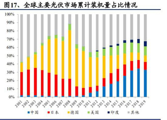 光伏中长期需求增长逻辑不变。从 IEA 测算的 2019 年各国光伏发电理论渗透率来看,世界平均值仅为 3.0%,欧盟达到了 4.9%,诸多新兴市场的渗透率仍然较低,中长期仍有较大发展空间。从历史累计装机数据来看,2010 年以来传统光伏装机大国,如日本、德国的新增装机容量全球占比在逐步下降,而美国、印度和其他新兴市场占比在快速上升。BNEF 统计 2019 年有 16 个新增装机量超过 1GW的市场,也预计 2020 年全球有 22 个市场在新增装机超过 1GW,光伏需求不再依赖于少数几个大型市场的趋势在未来越来越明显。