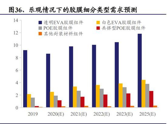透明 EVA 胶膜需求小幅增长,白色 EVA 及 POE 胶膜市场渗透率提升预期充足。根据 CPIA 对胶膜产品结构的预测,随着双面组件的市场占比提高,预计透明 EVA胶膜的市场份额逐年递减,2025 年或仅占据 50%。尽管在保守预测下透明 EVA市场略有萎缩,但由于全球装机增长前景明确,传统胶膜的需求在 5 年的中长期内仍将保持正向趋势。在组件整体需求增大和渗透率提升的背景下,白色 EVA、POE 和共挤型胶膜需求在未来几年内保持良好增长态势,乐观预计年复合增长率分别为 9.2%、14.6%和 44.4%,共挤型胶膜由于目前市场需求基数小,增长幅度较大。