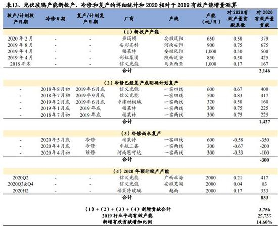 我们测算 2020 年全年光伏玻璃实际新增产量相比 2019 年提升 15%左右,短期玻璃价格的下调反映了供过于求的现状。展望 2020H2,需求端随着海外公共卫生事件逐步得到控制和国内需求环比上半年明显增加,而供给端玻璃新增产能实际贡献的时期更多在 2020Q4 及之后时间,我们测算 2020H2 光伏玻璃实际新增产量相比 2020H1 环比只增加 5%左右,可能显著小于需求的增长,光伏玻璃价格有回升空间。