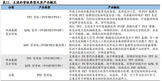 光伏背板是一种位于光伏组件背面的光伏封装材料,在户外环境下主要用于保护光伏组件抵抗光湿热等环境影响因素的侵蚀,起耐候绝缘保护作用。由于背板位于光伏组件背面的最外层,直接与外部环境相接触,因而光伏背板必须具备优异的耐候性(包括但不限于耐高低温、耐紫外辐照、耐环境老化)和水汽阻隔、电气绝缘等性能,以满足光伏组件 25 年的使用寿命。随着光伏产业对发电效率要求的不断提升,部分高性能太阳能背板产品还具有较高的光反射率,以提高太阳能组件的光电转化效率。