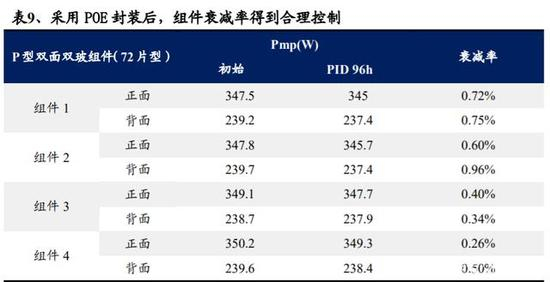 双面组件市场渗透率提升带动 POE 胶膜需求。由于双面电池背面钝化不完全、细小铝线印刷的铝栅格更容易被酸腐蚀、无框或半框封边导致空气水汽进入等原因,无特别防护的双面电池背面 PID 衰减可达 15-50%。而 POE 胶膜具有优异的水汽阻隔能力和离子阻隔能力,水汽透过率仅为 EVA 的 1/8 左右,在湿度较大的环境中表现突出,且其分子链结构稳定,老化过程不会分解产生酸性物质,具有优异的抗老化性能,目前行业普遍采用 POE 胶膜进行双面组件封装。