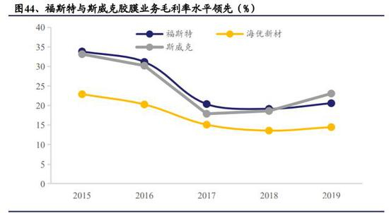 福斯特与斯威克毛利润水平领先。2019 年两大龙头厂商福斯特与斯威克胶膜销售毛利率水平相近,分别为 20.58%与 23.06%,显著高于海优新材的毛利率14.45%。毛利率水平的优越一方面显示了两大厂商在市场中的定价优势,另一方面体现了公司对于成本端的合理控制。