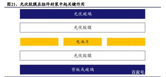 (2)胶膜(普通 EVA/白色 EVA/POE):是一种乙烯—醋酸乙烯酯共聚物经过加工后而成的化学品,是光伏组件不可或缺的封装材料,与玻璃和背板相互黏合,对电池片进行保护。随着双面发电组件的普及率提升,普通 EVA 已经不能满足市场需求,专门用于背面黏合的白色 EVA 和用于双玻产品的 POE 也逐步推广开来。