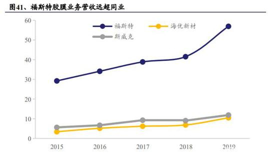 营收领先,2019 年福斯特胶膜业务收入同比增长 37%。与销量对应,福斯特胶膜业务营业收入多年保持领先地位,2019 年,受益于产能扩张,营收同步大幅增长至 56.95 亿元,同比增长超 37%,实现胶膜业务毛利润 11.72 亿元,进一步拉大与竞争者的距离,竞争优势凸显。