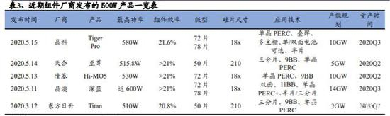 新技术路线的普及也明显促进了效率的提升。新的技术路线促使各个时期主流的组件功率不断快速提升,例如硅片环节单晶硅片和大尺寸硅片的普及、电池片环节 PERC 等电池技术的运用和组件环节各项新技术的推广。在各个环节新技术的加持下,近期行业已经推出了多款能够量产的 500W 以上的组件。