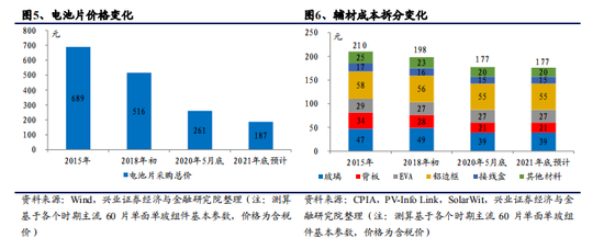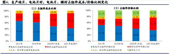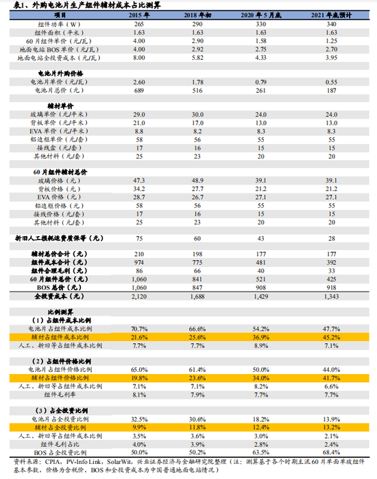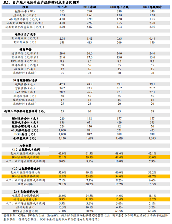 当前辅材占组件价格比例约为 34%。如果考虑组件环节一定的毛利率,辅材采购成本占组件价格的比例从 2015 年的 19.8%提升到近期的 34.0%,我们预计随着硅料——硅片——电池片的环节的成本下降,2021 年底辅材成本占组件价格的比例预计提升至 41.7%