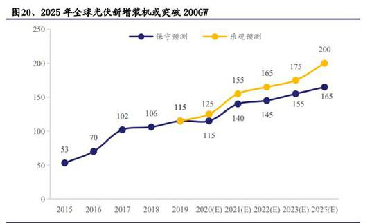 可持续发展成为全球共识,清洁能源不可或缺。全球各国已逐渐意识到传统的煤炭、石油等化石燃料的使用给环境和气候带来的严重破坏,因此均采取行动来支持太阳能、风能等可再生能源的发展,如电价补贴、配额制和税收优惠等。在政策激励下,光伏行业增长迅猛,发电占比逐渐提高。虽然疫情对海外光伏项目存在一定影响,但大部分项目仅是延期,海外招标和采购仍在如期进行,中长期来看电力规划受疫情影响不大。根据 CPIA 预测,全球光伏装机预期良好,2025 年新增装机或可达 200GW,年复合增长率约为 6.2%至 9.7%。