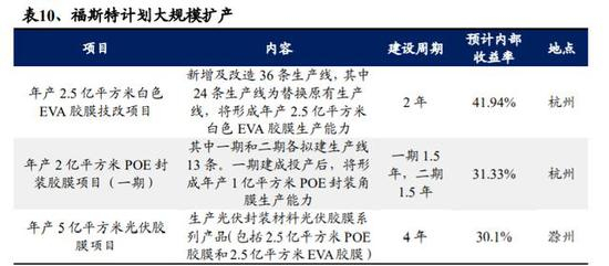 根据公告所示的项目建设周期,假设公司扩产计划如期推进,年产 2.5 亿平方米白色 EVA 胶膜技改项目和年产 2 亿平方米 POE 封装胶膜项目(一期)2021年投产,年产 2 亿平方米 POE 封装胶膜项目(二期)2022 年投产,滁州光伏项目 2024 年投产,则 2024 年福斯特总产能将接近 17 亿平/年,达到 2019 年产能 2倍以上。