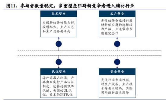 辅材行业具有多重壁垒,阻碍新参与者进入,主要包括技术、客户资源、产品认证以及资金壁垒。一方面,由于光伏组件对于封装材料的要求严苛,产品需通过专业认证才能被厂商认可,辅材制造对生产设备、生产技术等提出了极高要求,厂商需要投入大量资金购置专业设备以及后续研发,在资金、技术方面建立了行业壁垒。另一方面,光伏组件生产企业的供应商选择流程繁杂,因此一般会建立长期稳定的合作关系,这对新进入的生产企业构成一定的客户资源壁垒。