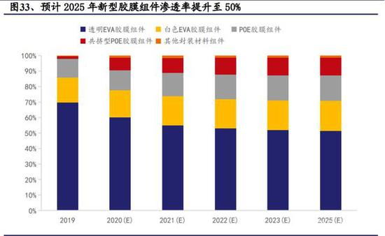 新型胶膜市场份额有望继续扩大。在双面组件渗透率提升的背景下,由于白色EVA、POE 胶膜和共挤型胶膜具有众多透明 EVA 胶膜缺乏的特征与优势,其市场份额的提升指日可待,预计 2025 年新型胶膜组件可占据组件市场约 50%。