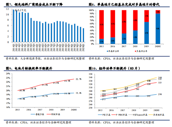 工艺改良促进降本。硅料——硅片——电池片——组件(辅材除外)各个环节在过去一段时间均通过工艺的改良带来生产过程中单位能耗、单位原材料消耗、单位人工等方面的下降,以硅料领先厂商为例,2014Q1 至 2020Q1 的现金成本下降了 57%。