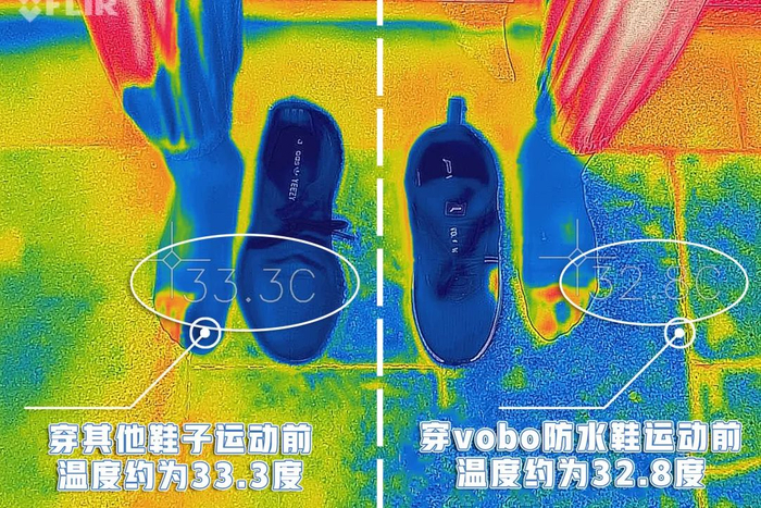 这是咱们测试之前脚的温度,左侧(普通鞋子)是33.3℃,右侧(VOBO防水鞋)运动前温度是32.8℃。