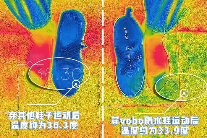 这时候左脚(普通鞋子)是36.3℃,右脚(VOBO防水鞋)是33.9℃,有透气设计的VOBO防水鞋明显更凉爽。
