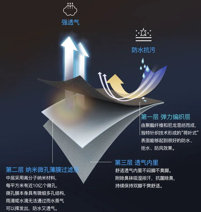 而中层的微孔透气薄膜,也能保证脚上蒸发的热气,第一时间透出来,爽爆了!