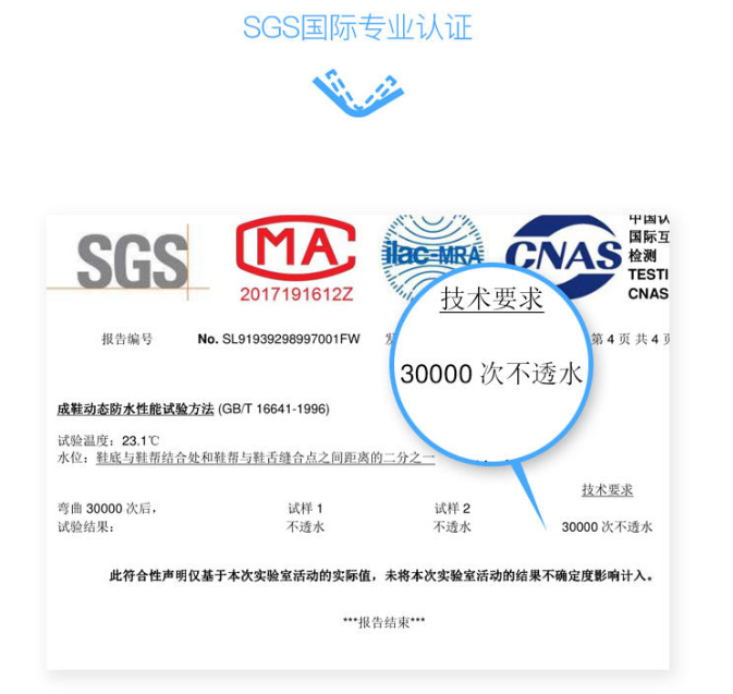 更重要的是,经过国家专业机构检测,咱们这双鞋子30000+次测试都不透水,买回家可以放心大胆的穿,不会“过期”。