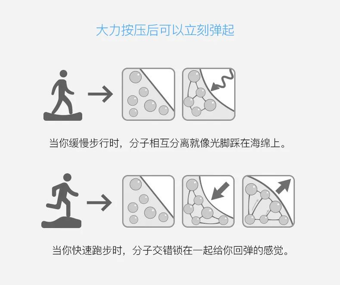 当缓慢步行的时候,分子相互分离就像光脚踩在海绵上一样,当快速跑步的时候,分子交错缩在一起,形成回弹的感觉。