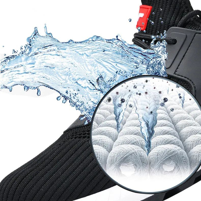 第二层采用了纳米微孔薄膜过滤层设计,每平方米有近10亿个微孔,这种小孔雨滴和水滴是无法渗透的,给防水鞋加了第一层保护盾。
