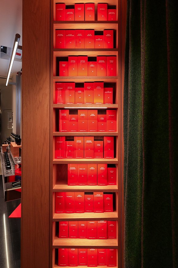 如果中国消费者曾经逛过馥马尔在巴黎、纽约等海外精品店,应该可以在中国首店内看到类似的陈设:跟出版物一样的香水包装盒摆放在陈列柜上,看起来像一面书架。