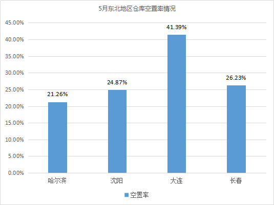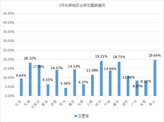 全国32个城市仓库平均空置率为14.78%,环比上升0.96个百分点。其中,东北地区仓库空置率(28.44%)远高于中部(13.62%)、西部(12.73%)、东部(12.58%)地区。相较4月,东北、东部地区仓库空置率有小幅上升,升幅分别为2.44(东北地区)和1.35(东部地区)个百分点;西部、中部地区仓库空置率相对稳定,升(降)幅变化在±0.5个百分点以内。