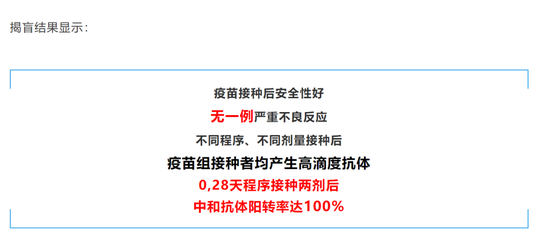 揭盲结果显示:疫苗接种后安全性好,无一例严重不良反应。不同程序、不同剂量接种后,疫苗组接种者均产生高滴度抗体,0,28天程序接种两剂后中和抗体阳转率达100%。