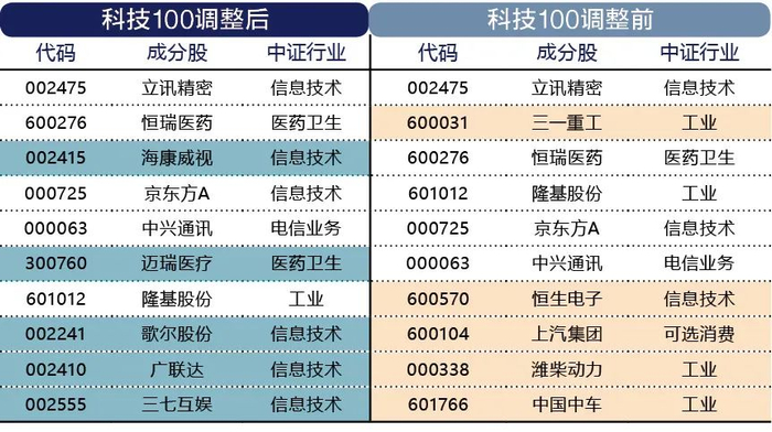 在前十大成分股中,科技100指数调整后相比调整前增加了迈瑞医疗、海康威视、歌尔股份、广联达和三七互娱,而剔除了三一重工、恒生电子、上汽集团、潍柴动力以及中国中车。