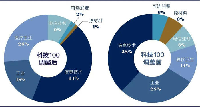 而从行业分布上来看,医疗卫生、信息技术比重提升,工业、原材料比重下降。科技100指数调整后,医疗卫生与信息技术行业的合计占比已超过70%。