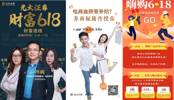 处于财富管理转型的券商也都使出浑身解数,线上“摆地摊”开启,举行不同形式的“6·18”活动,产品大打折扣、明星直播销售、红包豪礼相送,琳琅满目、应有尽有。