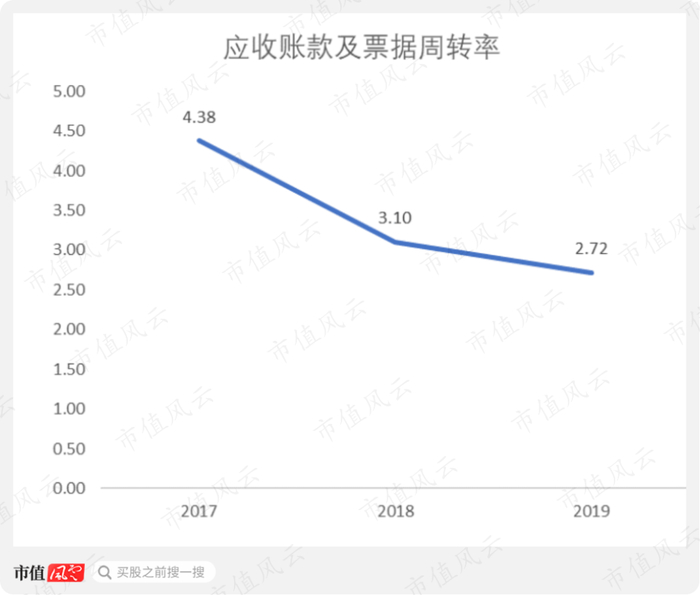 2017-2019年,应收账款及票据的周转率从4.38下滑至2.72,耳东影业的回款压力越来越大了。