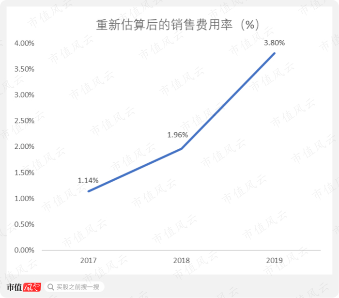 下图显示,销售费用率从2018年的2.63%突然大幅增长至2019年的9.88%。