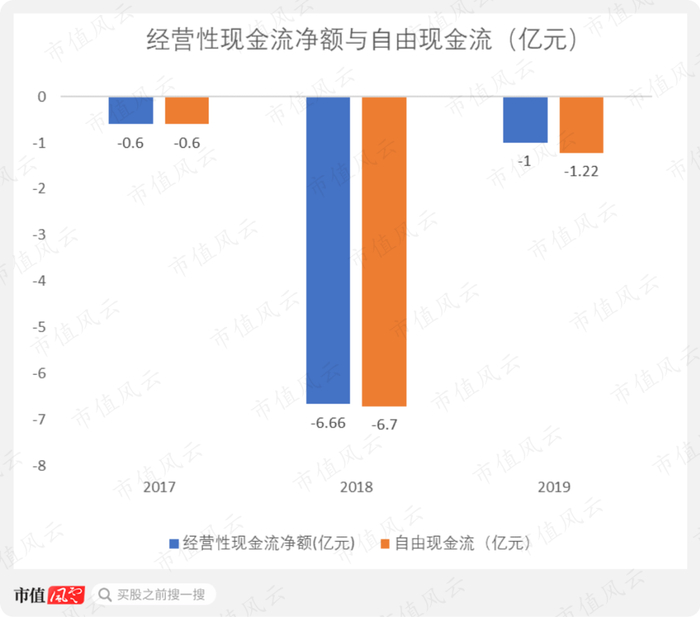 2017-2019年,耳东影业的经营性现金流一直在净流出,2018年更是净流出6.66亿元。自由现金流也是同经营性现金流净额一样糟糕。