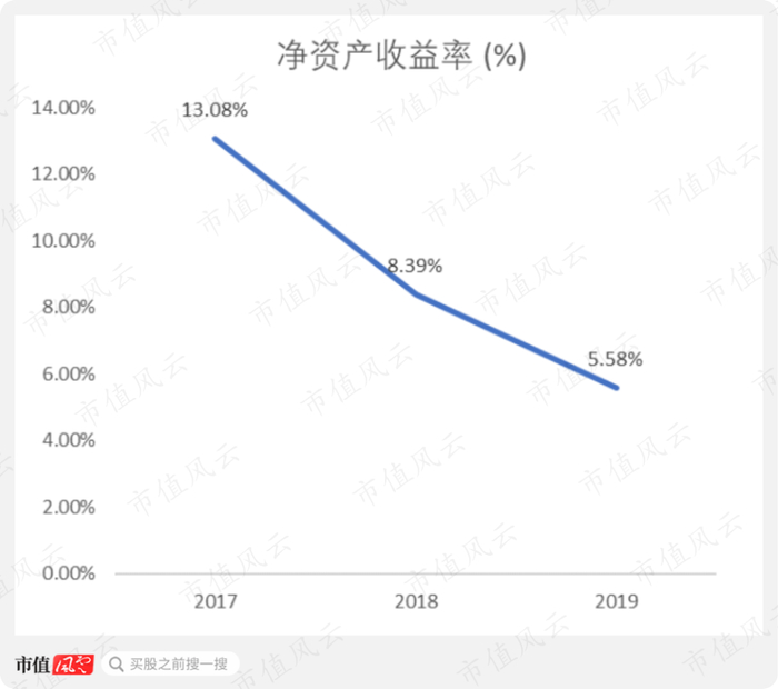 由于净利率的下滑,净资产收益率也跟着从2017年的13.08%下滑至5.58%。