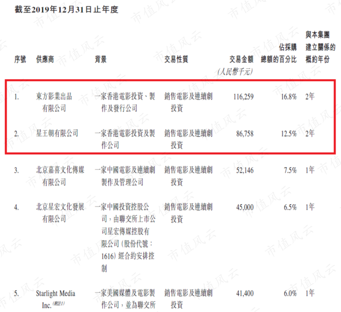 2019年,前五大供应商占当年总采购金额的49.3%,第一、二大供应商均是香港影视公司,分别是东方影业、星王朝,分别占当年总采购金额的16.8%、12.5%。