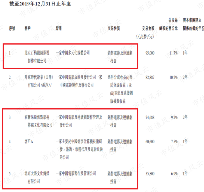 2019年,耳东影业前五大客户贡献了总收入的45.5%,前五大客户中除了第二大客户,其交易性质均是电影份额的销售,这些客户实际上就是电影份额的受让方。