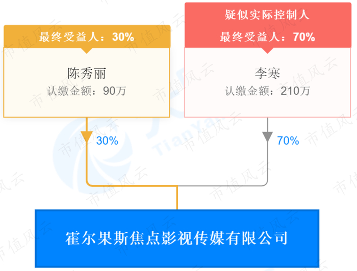 根据天眼查的资料,霍尔果斯焦点影视成立于2017年,只有两位股东:陈秀丽和李寒。