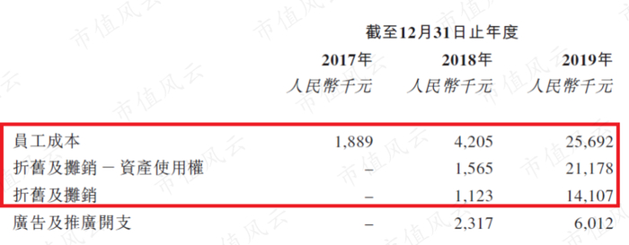 仔细翻看明细,销售费用的增长主要来自两块:一是员工成本,二是折旧及摊销,也就是所租物业和所购买设备的折旧及摊销。2018-2019年,销售费用里的员工成本扩大了5倍,折旧及摊销扩大了12倍。