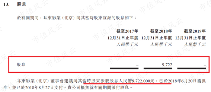 估计也是因为缺钱,耳东影业目前只进行过一次现金派息,就是2018年派发的972.2万元,金额也不大。
