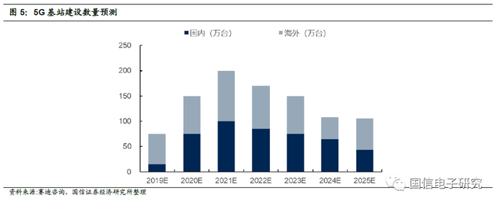 5G基站MLCC用量较4G基站大幅提升。5G因为高频、短波的特性,需要更密集的基站布置,基站建设数量为4G基站的2倍。据赛迪咨询预测,全球将迎来基站建设潮,2021年将实现200万个5G基站建设;工信部数据表明,2019年中国已开通12.6万个5G基站,我国将5G基建纳入“新基建”之中,三大运营商有望进一步优化和扩大5G投资,5G基站建设将在2021年达到峰值100万个。