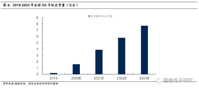 5G将孕育出新一轮手机换机的市场需求。据统计,2019年全球5G手机出货量约为1870万台,2023年5G手机出货量将达到7.7亿。根据单个5G手机用量300颗增量的测算,随着5G手机渗透率的提升,2023年5G手机将带来超过2千亿个MLCC增量需求。