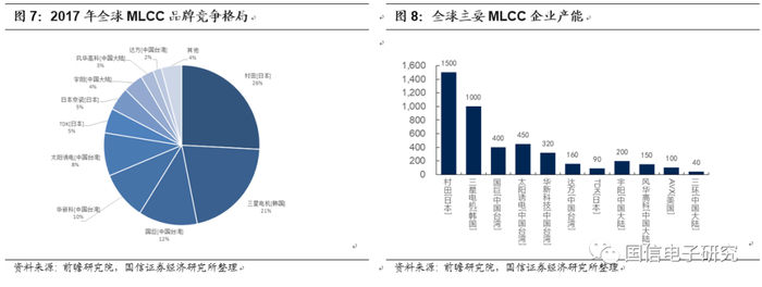 全球市场份额高度集中于日韩厂商。纵览MLCC全球市场,市场份额呈现高度集中,CR5接近80%。从市场份额及产能可以看出,村田、三星电机优势明显,为第一梯队;国巨、太阳诱电、华新科处于第二梯队;宇阳、风华高科、三环集团等中国大陆企业位于第三梯队。
