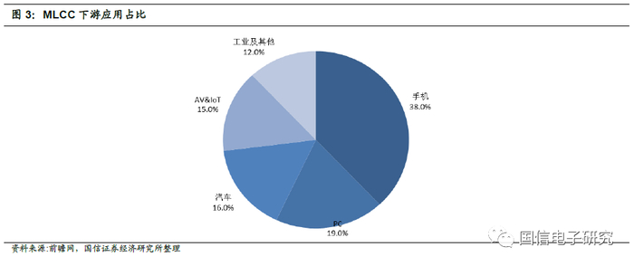 MLCC具有体积小、频率范围宽、寿命长、成本低的优良特性,被应用广泛于手机、PC、汽车、影音及IOT、工业等领域。手机是MLCC的最大应用领域,占比达38%,手机电子主要采用0201、01005、008004等小型尺寸高频产品;汽车是另一个正在增长的市场,在汽车电子领域,应用最多的是0603、0805、1206等大尺寸产品,对于产品的耐高温、可靠性提出了高要求。