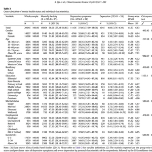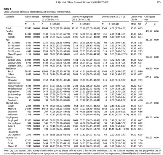 至于中国的情况,发表于2018年的Xuezheng QIN等学者的论文显示:在中国农村地区以及中西部省份,抑郁症的患病率也往往较高,在论文中作者团队指出:“我们还发现一个重要的社会经济与个体心理健康的梯度:高等教育和高收入水平者患抑郁症的可能性较低(以上为记者翻译)”。