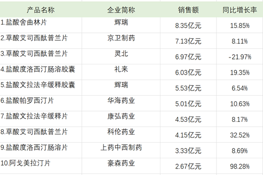 2019年中国公立医疗机构销量前十的抗抑郁药产品