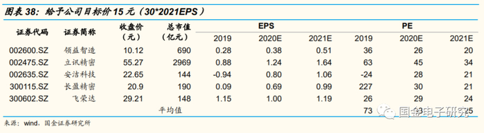 ◾ 采取PE估值,给予目标价15元。我们选取立讯精密、安洁科技、长盈精密、飞荣达作为可比公司,给予公司2021年30倍PE估值,对应目标市值1017亿元,对应目标价15元,给予买入评级。