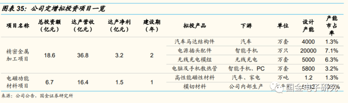 ◾ 公司2019年发布定增预案,并已获证监会核准批复。公司拟募资不超过30亿元用于投资精密金属加工和电磁功能材料项目。项目建成后,进一步丰富公司产品品类,横向拓展汽车、家电等领域。预计项目建成达产后贡献营收53亿元、净利4.7亿元。