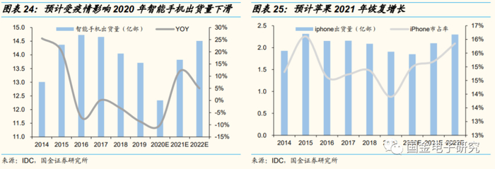 ◾ 得益于“迟到的”5G换机需求,预计2021年全球智能手机需求恢复增长。2019年中国启动5G商用,此前市场普遍预期2020年5G换机潮将推动全球智能手机恢复增长,但由于疫情影响、预计2020年换机需求将推迟至2021年。得益于“迟到的”5G换机需求、2020年低基数效应,预计2021年全球智能手机需求将恢复增长。