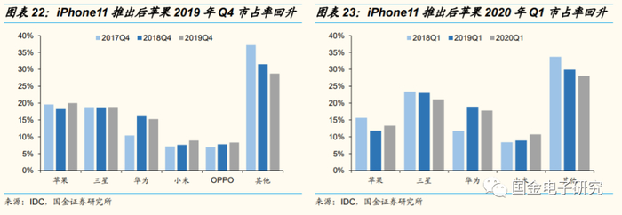 ◾ 短期华为承压高端客户或流入iPhone阵营,低价版+5G版iPhone助力iPhone重返增长。2020年5月15日,美国对华为禁令再次升级,预计短期华为高端机出货量承压,高端机消费者或部分流入iPhone阵营。得益于iPhone11降价、低价版iPhone SE推出,A客户2019年Q4、2020年Q1市占率连续回升。根据我们测算,iPhone的平均换机周期在3年左右,根据外媒报道、苹果今年有望推出首款5G iPhone,5G换机需求有望助力苹果2021年重返增长。