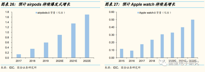 ◾可穿戴产品多点开花,AirPods全面爆发,Apple watch快速增长。1)TWS耳机全面提升消费者听觉体验,2018、2019年市场需求全面爆发,2019年AirPods出货量达6千万部,同增71%。止2019年AirPods累计销量仅1.1亿部,相较于苹果10亿终端用户渗透率仍低(仅10%),预计未来三年AirPods高速增长。2)2019年Apple watch出货量达0.3亿台,同增30%,持续高速增长。5G时代、传输速度提升有望让万物互联成为现实,预计未来三年Apple watch持续高增长。